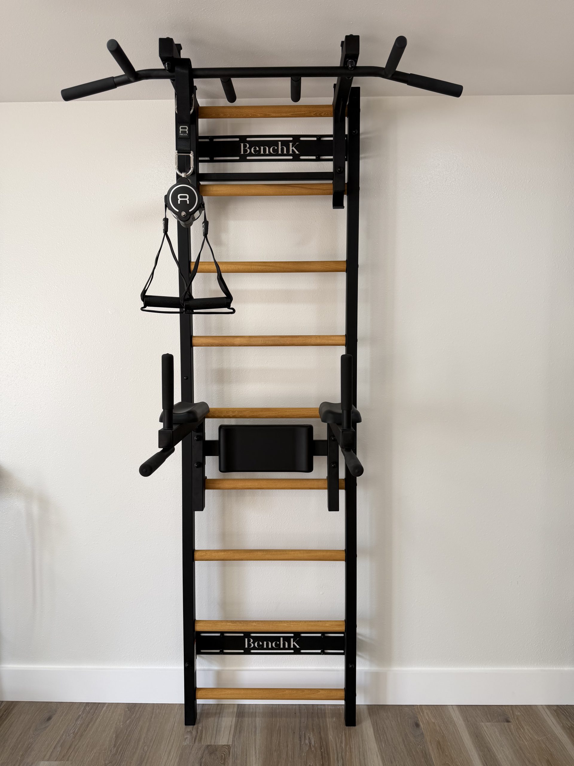 BenchK podchodzi do treningu jak do projektowania przestrzeni. Proporcje, linie i pionowa forma sprawiają, że system stapia się ze ścianą, zamiast zajmować pomieszczenie. Odczytujemy go najpierw jako element architektury, dopiero potem jako narzędzie treningowe. Dzięki temu trener nie musi układać całej strefy wokół maszyn, a strefa ruchu powstaje naturalnie wokół jednego elementu.